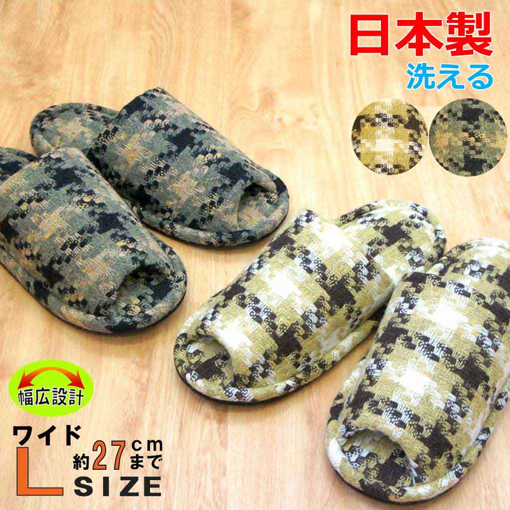 スリッパ メンズ ウール綾格子外縫い ワイドLサイズ 約27cmまで 日本製 洗える チェック 大柄